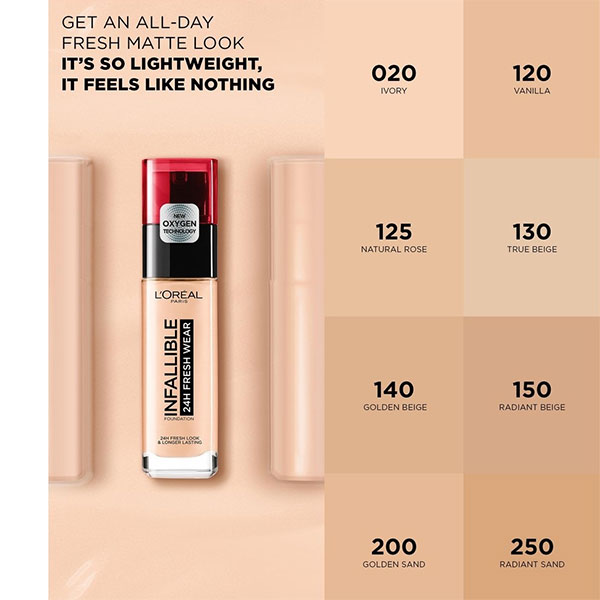 کرم پودر Infallible لورآل، با پوشش و ماندگاری 32 ساعته، رنگ پوست را یکنواخت می کند. این کرم پودر دارای SPF25 و ویتامین C است که از پوست در برابر اثرات مخرب نور خورشید محافظت می کند. کرم پودر لورآل ضد حساسیت است و رطوبت و تعریق در پوشش آن تغییری ایجاد نمیکند.